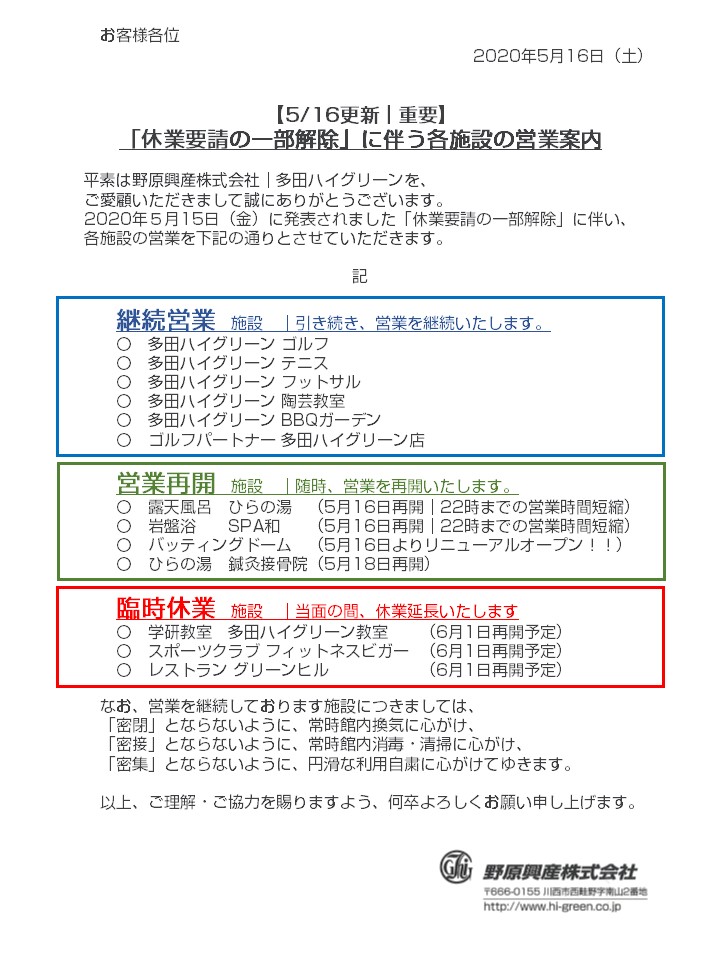 【5/16更新|重要】休業要請の一部解除に伴う各施設の営業案内